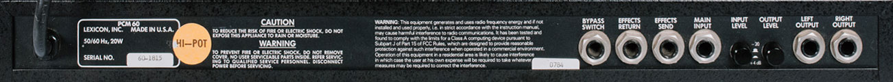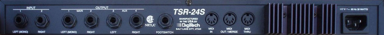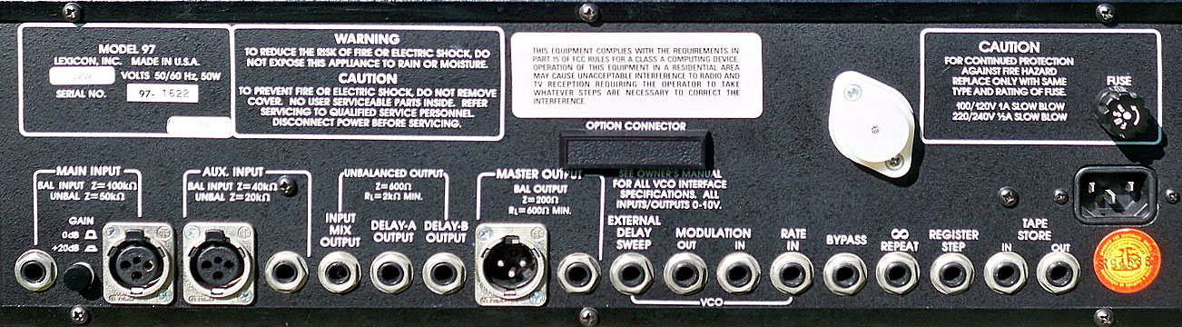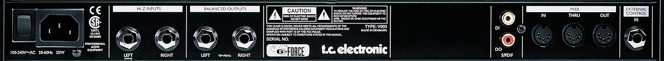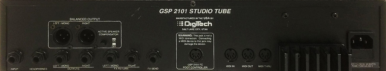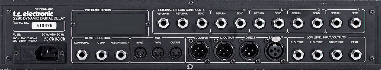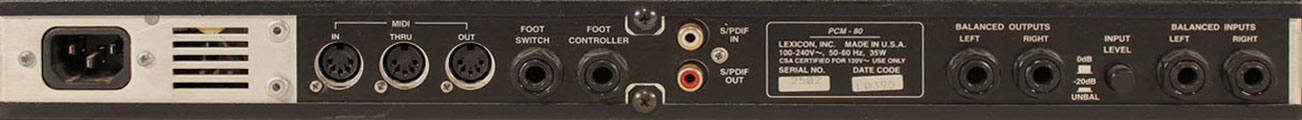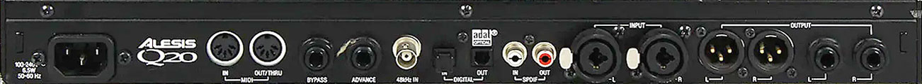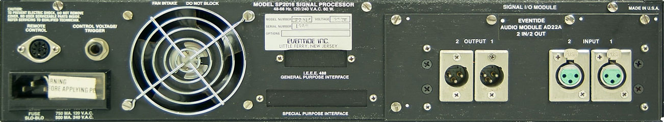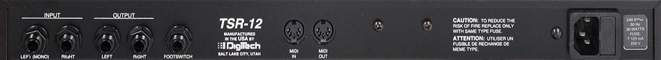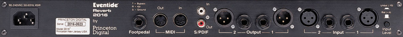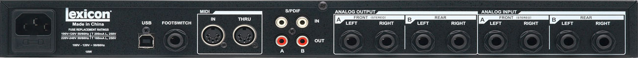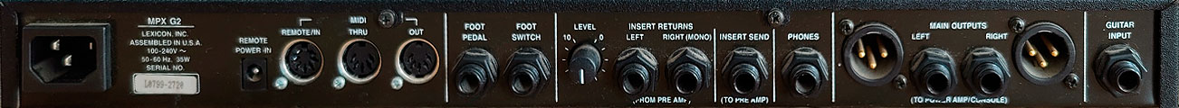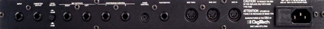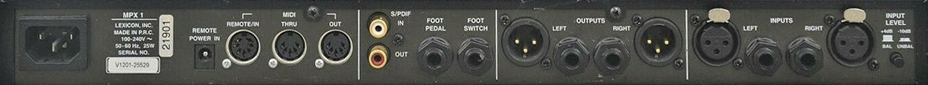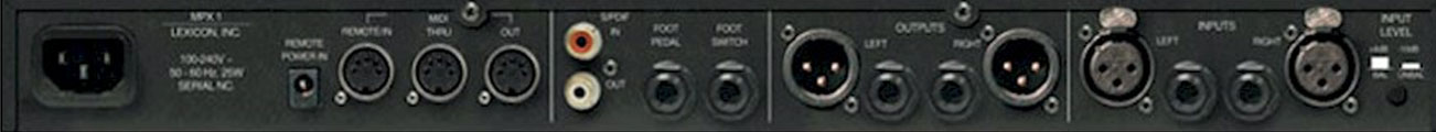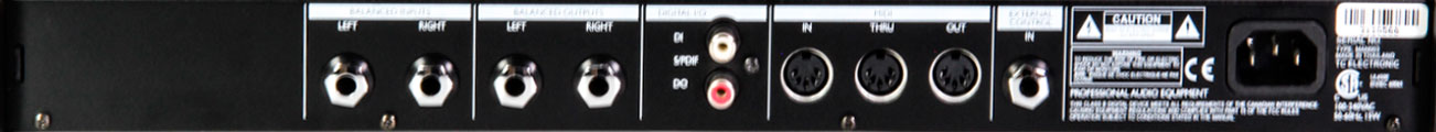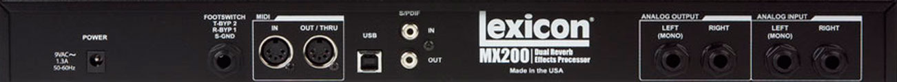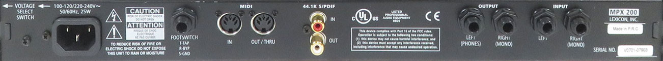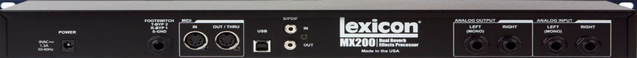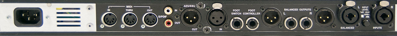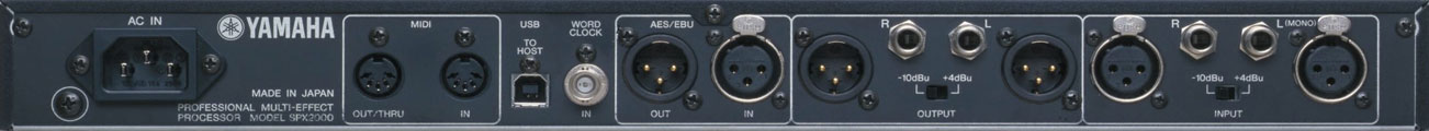 For analog input and output the SPX2000 rear panel has latching XLR type connectors as well as quarter-inch phone jacks for the left and right channels. A +4 dBu/-10 dBu selector switch provides extra level-matching flexibility. Digital connection is facilitated via AES/EBU XLR type I/O connectors and a BNC WORDCLOCK IN connector. MIDI IN, OUT/THROUGH and USB TO HOST connectors are provided for remote control and data management using a computers digital mixing console, or MIDI device. A footswitch connector for effect tempo control is provided on the front panel.