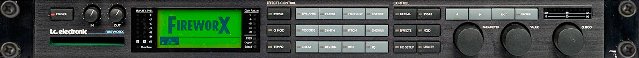 Not a rack effectsprocessor, but non the less wortha mention, because it's truely unique: the Air FX is one of the last products to come out of the origional Alesis. It's a 50 preset-multi effecfs unit with an 3 dimentional control over 3 parameters using infrared sensors.