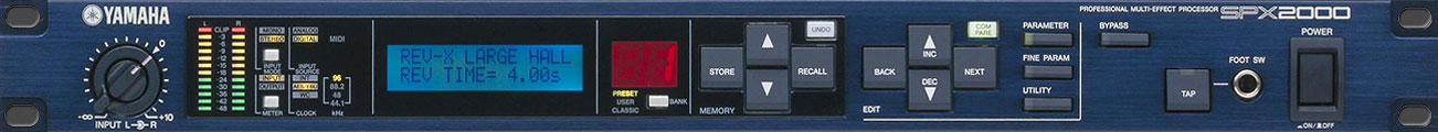 For more than 15 years the letters "SPX" have been synonymous with professional multi-effect processors, and over that time you would almost always find an SPX90, SPX90II, SPX900, SPX1000 or SPX990 in any well-equipped studio or live-sound rack. The SPX2000, while inheriting the standard interface and popular programs from its predecessors, brings a new dimension to the SPX sound with advanced REV-X reverb algorithms and 24-bit, 96k-Hz audio processing. It also offers an innovative user interface with features such as five assignable LCD backlight colors, operation lock modes, and computer-based editing. The SPX2000 is a new-generation multi-effect processor that delivers performance that is a perfect match for Yamaha's DM series Digital Production Consoles, and is suitable for applications from live sound to production studios.